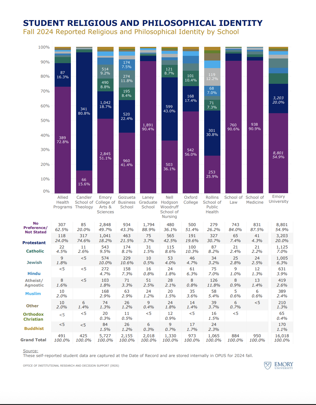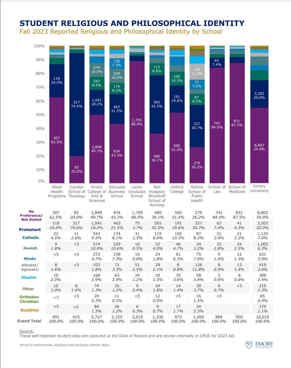 Limitations of Data: This data is self-reported on admissions applications to the university rather than after enrollment (when there would be a higher likelihood of response). It also does not allow students to indicate multiple religious belonging. The unevenness of reporting across schools suggests less than full accuracy. It is currently the most accurate information available.